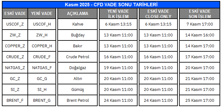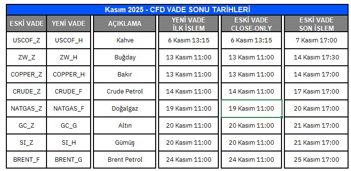 Kasım 2025 döneminde vadesi bitecek CFD ürünlerimizi aşağıdaki tabloda bulabilirsiniz.