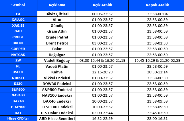 ABD'de kış saati uygulamasının sona ermesi ve yaz saati uygulamasının başlaması sebebiyle 09.03.2026 Pazartesi günü itibariyle kaldıraçlı alım satım işlemlerinde saat 00:58 olan gün sonu, saat 23:58 olarak değiştirilecektir.