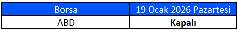 19 Ocak 2026 Pazartesi Günü Martin Luther King tatili olması nedeni ile ABD Borsaları kapalı olacaktır.