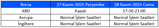 27 Kasım 2025 Perşembe ve 28 Kasım 2025 Cuma günü, Amerika Birleşik Devletleri'nde Şükran günü tatili sebebiyle yurt dışı borsaların işlem saatleri aşağıdaki gibi olacaktır.
