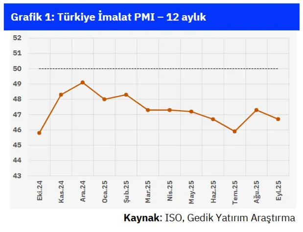 İstanbul Sanayi Odası Türkiye İmalat PMI, Eylül’de 46,7’ye gerileyerek Ağustos’taki 47,3 seviyesinden düşüş gösterdi. Endeks, üst üste 18 ay 50,0 eşik değerinin altında kalsa da Nisan 2025’ten bu yana kaydedilen en ılımlı bozulmayı gösterdi. İSO’nun yayınladığı basın bülteninden öne çıkardığı bazı tespitleri şöyle özetleyebiliriz: