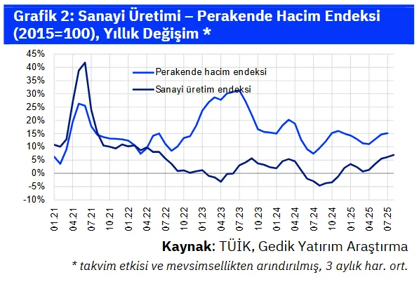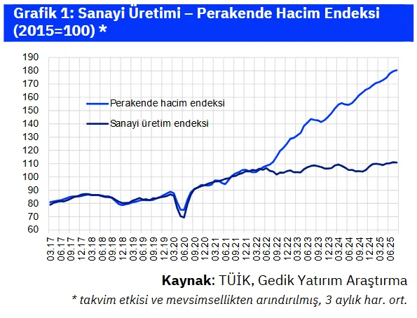 Sermaye malı, metal eşya, enerji, ana metal ve gıda sektörleri büyümeye pozitif katkı verirken; tekstil, giyim ve makine-teçhizat gibi emek yoğun alanlarda üretim gerilemesi dikkat çekiyor. Motorlu kara taşıtları üretimi yıl genelinde sınırlı da olsa büyüme yönüne geçmiş görünüyor. Genel olarak sanayi üretimi ekonomik aktiviteye kademeli katkı sağlarken, talep koşullarındaki zayıflık ve dış talep belirsizlikleri önümüzdeki dönemde üretim artışını sınırlayabilecek unsurlar olarak öne çıkıyor; sermaye malı üretimindeki çift haneli büyüme ise yatırım eğilimlerinde kısmi canlanmayı işaret ediyor. Kredi koşullarındaki gevşeme beklentisi, yılın kalan dönemi için temkinli bir iyimserlik sağlarken; dış talep ve küresel büyüme belirsizlikleri, sanayi üretimi açısından temel risk unsuru olarak öne çıkıyor.