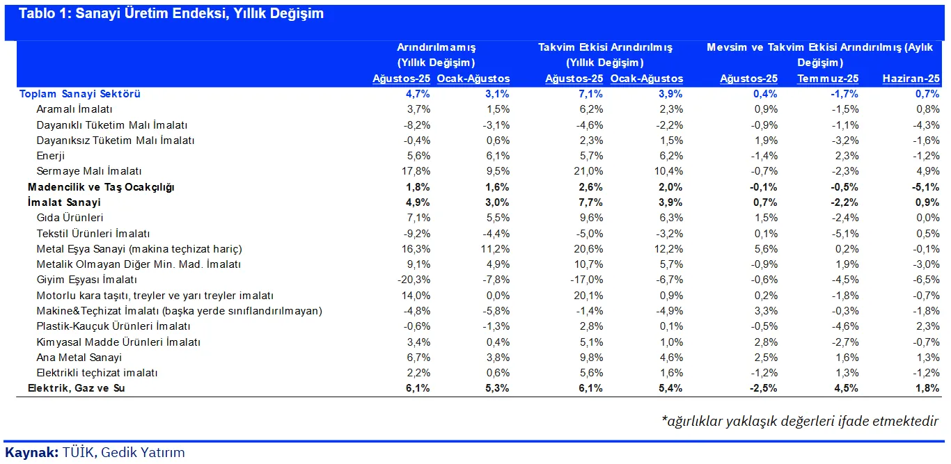 Ocak–Ağustos dönemine bakıldığında ise toparlanmanın daha ılımlı ve yine dengesiz bir görünüme sahip olduğu görülüyor. Bu dönemde sermaye malı imalatı (%10,4), metal eşya sanayi (%12,2), enerji (%6,2), ana metal sanayi (%4,6), metalik olmayan mineraller (%5,7), gıda ürünleri (%6,3) ve kimyasal madde ürünleri (%1) üretimini artırmayı başarmış görünüyor. Buna karşın, makine-teçhizat (-%4,9), giyim eşyası (-%6,7), tekstil (-%3,2) ve dayanıklı tüketim malları (-%2,2) yıllık bazda gerileme kaydetti. Motorlu kara taşıtları (%0,9) ve plastik-kauçuk ürünleri (-%0,1) ise yıllık bazda bu dönemde sınırlı da olsa büyüme tarafına geçti.