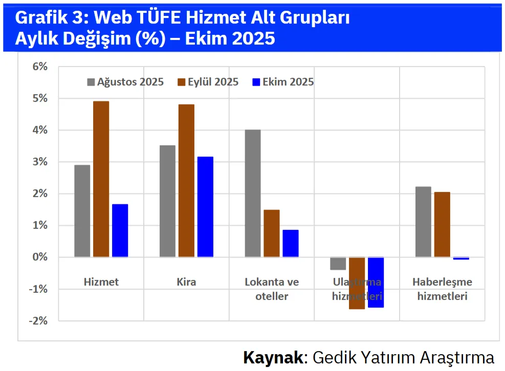 Ekim ayında aylık hizmet enflasyonunun %1,9 olacağını tahmin ediyoruz. Bu durum, geçtiğimiz yılın Ekim ayına göre benzer oranda bir artışa işaret etse de Eylül ayındaki yoğun fiyat artışlarının ardından son çeyrekte mevsimsel olarak hizmet enflasyonunun yavaşlayacağını göstermektedir. Kira enflasyonu Eylül ayındaki yüksek sözleşme yenileme oranlarına rağmen aylık bazda yavaşlamıştır. Bu durum bize mevsimsel düzeltilmiş verilerden de anlaşılacağı üzere kira enflasyonunda iyileşmeye işaret etmektedir. Ekim ayında da bu yavaşlamanın sürmesini ve aylık kira enflasyonunun %3,5 seviyesinde gerçekleşerek yıllık bazda düşüşüne devam etmesini bekliyoruz. Lokanta ve otel grubunda sezonun bitmesiyle otel fiyatlarının gerilediğini, lokanta fiyatlarının ise ılımlı arttığını takip ettik. Ulaştırma hizmetleri grubunda ise geçtiğimiz ay yapılan toplu taşıma zamlarının bir kısmının bu aya sarktığını, şehirlerarası otobüs bileti ve uçak bileti gibi maddelerde fiyatların gerilemeye devam ettiğini söylemek mümkün.