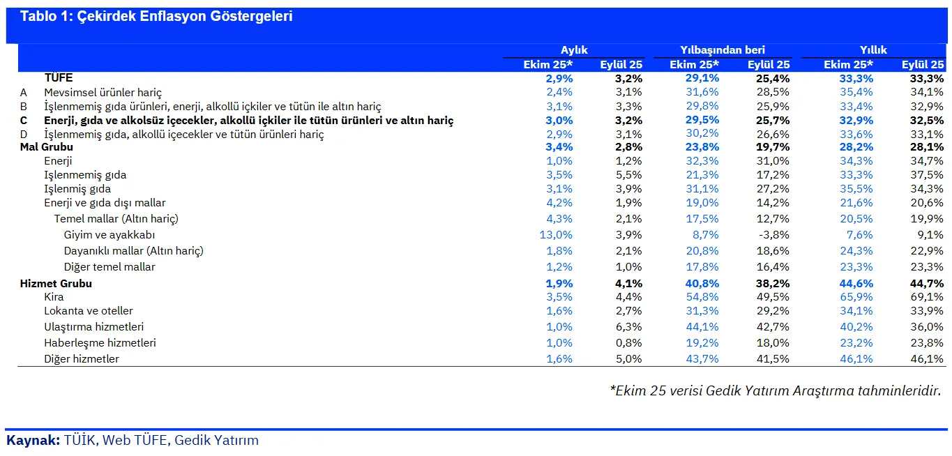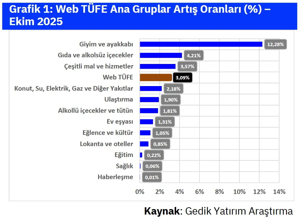 Ekim ayında web üzerinden topladığımız Web TÜFE verilerine dayanarak aylık enflasyonun %2,90 olarak gerçekleşeceğini ve %3,09 olarak gerçekleşen Web TÜFE verisinin kapsam farklılıkları sebebi ile bir miktar altında gerçekleşeceğini tahmin ediyoruz. Özellikle gıda grubunda işlenmiş gıda alt grubunda son aylarda gerçekleşen yüksek fiyat artışlarının web fiyatlarına gecikmeli biçimde yansıdığını değerlendiriyoruz. Diğer gruplarda görece benzer oranda gerçekleşeceğini düşünüyoruz.
