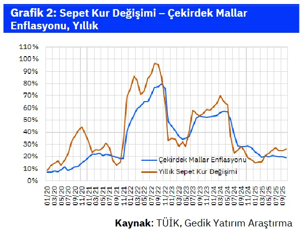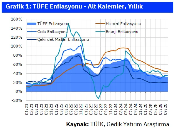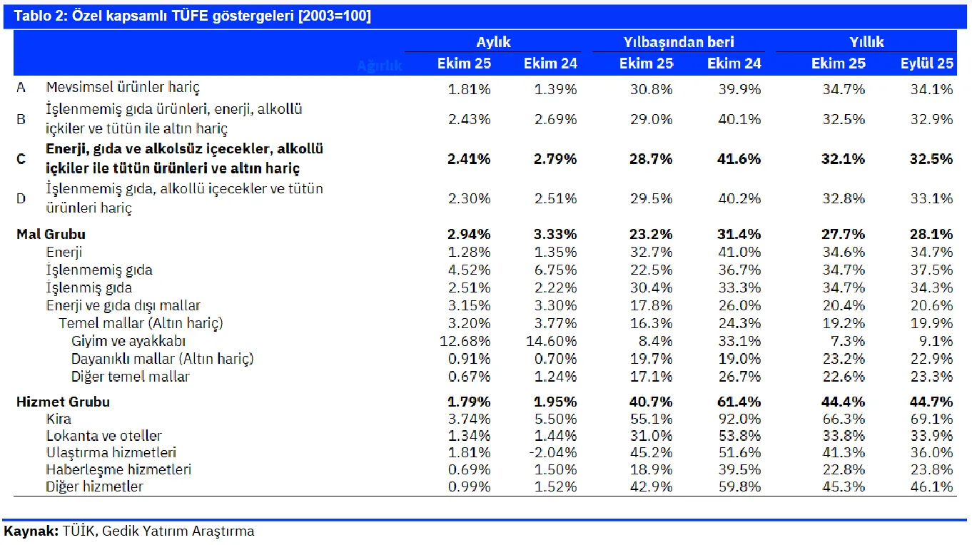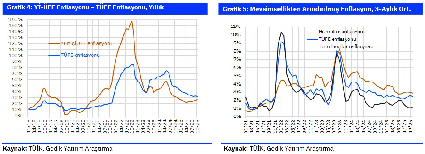 Ekim ayı TÜFE enflasyonu sonrası, 10 aylık kümülatif TÜFE enflasyonu %28,6 seviyesine ulaştı. Buna bağlı olarak, TCMB’nin 7 Kasım’daki Enflasyon Raporu toplantısında sene sonu için %25-29’luk tahmin aralığını yukarı yönlü revize etmesi de kaçınılmaz görünüyor. Bununla beraber, TCMB’nin asıl 2026 sonu tahminini revize edip etmemesi, para politikası duruşu adına mesaj verecek. Şöyle ki, TCMB’nin tahmini değiştirmemesi, para politikasının 2026’da oldukça sıkı tutulacağı şeklinde yorumlanmalı. Öte yandan, TCMB (geçmiş dönemlerde yaptığı gibi) bu tahminlere ulaşmanın çok fazla parasal sıkılaşma gerektireceğini belirterek tahmin aralığını şimdiden yukarı revize etmeyi de tercih edebilir.