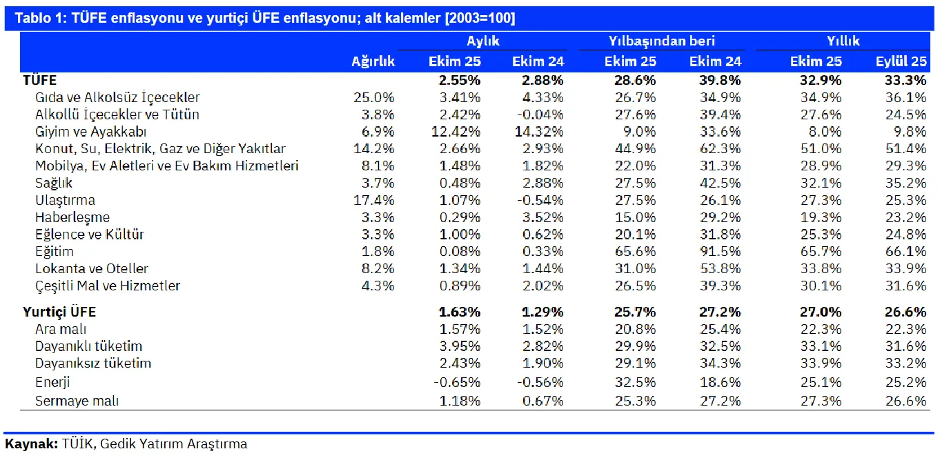 Ekim’de TÜFE enflasyonu beklentilerin altında %2,55 seviyesinde gerçekleşirken, yıllık TÜFE enflasyonu %33,3’ten %32,9’a geriledi. Ekim ayında TÜFE enflasyonu %2,7’lik medyan piyasa beklentisi ve bizim %2,9’luk tahminimizin altında %2,55 olarak gerçekleşti. Geçen yılın aynı ayındaki gerçekleşme %2,88 olmuştu. Bu sonuçla, yıllık TÜFE enflasyonu da %33,3’ten %32,9’a geriledi. Böylece yıllık TÜFE enflasyonu 1 aylık aranın ardından yeniden düşüşe işaret etti. Çekirdek TÜFE enflasyonu (C grubu) bizim %3,0’lük beklentimizin altında %2,4 olarak gerçekleşerek (Ekim 2024: %2,8) yıllık bazda %32,5’ten %32,1’e geriledi. Yurtiçi ÜFE enflasyonu aylık %1,63 seviyesinde gerçekleşerek (Ekim 2024: %1,29) yıllık bazda %26,6’dan %27,0’ye yükseldi. Böylece, Yİ-ÜFE enflasyonunda Nisan’da %22,5 seviyesinden başlayan ılımlı yükseliş eğilimi devam etti.