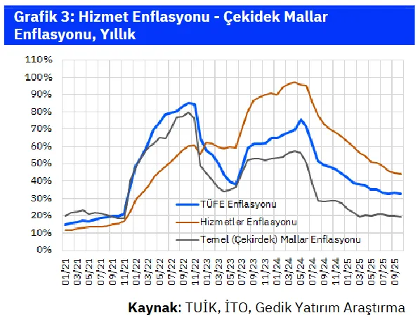 Alt kalemleri incelediğimizde, gerçekleşmeler genel olarak beklentilerimizle uyumlu görünüyor. Şöyle ki, gıda enflasyonu %3,3’lük beklentimize karşılık %3,4, giyim (mal) enflasyonu %13,0’lük beklentimize karşılık %12,7, hizmet enflasyonu %1,9 beklentimize karşılık %1,8, enerji enflasyonu %1,0 beklentimize karşılık %1,3, tütün ve alkollü içecekler enflasyonu ise %2,5 beklentimize karşılık %2,4 olarak gerçekleşti. Öte yandan, manşet enflasyonun beklentimizin altında kalmasını dayanıklı mallar ve diğer temel mallar kalemleri sağlamış görünüyor; biz bu iki kalemde %1,8 ve %1,2’lik artışlar beklerken, gerçekleşmeler %0,9 ve %0,7 oldu. Buna bağlı olarak da, %3,0 olarak öngördüğümüz çekirdek enflasyon (C grubu) %2,4 olarak ortaya çıktı. Kurdaki stabiliteye bağlı olarak, temel mal enflasyonu yıllık bazda da %19,2 gibi görece ılımlı bir seviyede seyrediyor. Öte yandan, hizmet enflasyonunun yıllık %44,4 seviyesinde kalması dezenflasyon sürecini ciddi anlamda yavaşlatıyor. Buna rağmen, aylık bazda %4,1’den %1,8’e gerileme her ne kadar mevsimsel olsa da olumlu karşılanabilir.