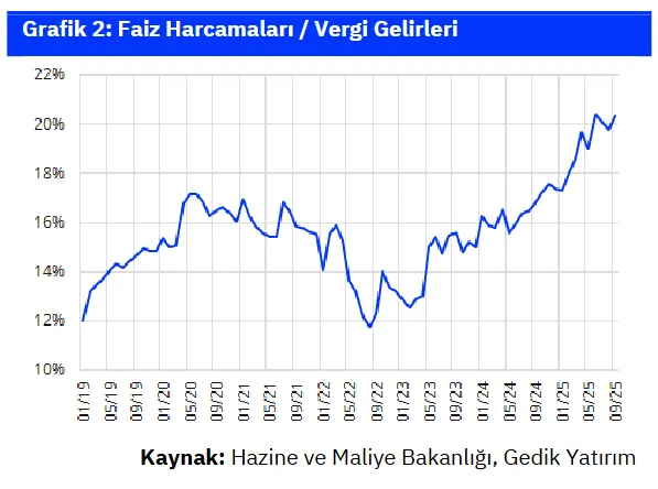Faiz-dışı taraftaki ciddi düzelmeye karşın, bütçe açığının artmaya devam etmesinin nedeni daha önce de çok kere belirttiğimiz üzere faiz harcamalarındaki hızlı yükselişler. Faiz harcamaları geçen senenin 9 aylık döneminde 913 milyar TL seviyesinde gerçekleşirken, bu yılın aynı döneminde 1,67 trilyon TL olarak ortaya çıkmış durumda, ki bu da %82’lik bir artışa işaret ediyor. Yandaki 2 nolu grafikten de görülebileceği üzere, son yıllarda vergi gelirlerindeki güçlü toparlanmaya rağmen, faiz harcamalarının daha hızlı artması sonucu, faiz harcamalarının vergi gelirlerine oranı yükselirken, bu durum bütçe açığındaki bozulmaya önemli katkı sağlamaktadır. Hatırlatmak gerekirse, Eylül başında yayınlanan 2026-2028 dönemi OVP’si ile faiz harcama projeksiyonu 2025 yılı için 1,95 trilyon TL’den 2,05 trilyon TL’ye, 2026 yılı için ise 2,28 trilyon TL’den 2,74 trilyon TL’ye revize edilmişti.