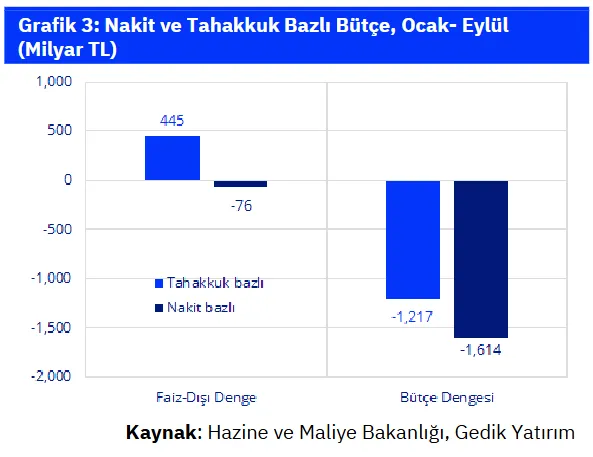 Merkezi bütçe Eylül’de 310 milyar TL açık verirken, 12-aylık birikimli açık 2,04 trilyon TL’den 2,25 trilyon TL’ye yükseldi. Eylül’de merkezi bütçe 309,6 milyar TL açık verirken, faiz dışı açık da 73,0 milyar TL oldu. Geçen yılın aynı ayında 100,5 milyar TL bütçe açığı ve 48,2 milyar TL faiz dışı fazla verilmişti. Ancak, geçen ayki makro raporumuzda da belirttiğimiz gibi, 2024 yılında Kurumlar Vergisi tahsilatlarının büyük kısmının, Gelir Vergisi tahsilatlarının da bir bölümünün Ağustos’tan Eylül’e kayması nedeniyle, Ağustos-Eylül rakamlarını toplu şekilde karşılaştırmak daha sağlıklı olacaktır. Böyle yaptığımızda da, Ağustos-Eylül döneminde toplamda 212,9 milyar TL bütçe açığına karşılık, 203,4 milyar TL faiz-dışı fazla verildiğini görüyoruz, ki bu rakamlar geçen senenin aynı dönemindeki 230,1 milyar TL bütçe açığı ve 15,7 milyar TL faiz dışı rakamlarına göre önemli bir iyileşmeye işaret ediyor. Enflasyona göre düzeltilmiş rakamları ise aşağıda Tablo 2’de görebilirsiniz. Bu dönemde vergi gelirlerindeki reel artış %17’ye yaklaşırken, faiz-dışı harcamalardaki reel artışın %5 ile sınırlı kalması, faiz-dışı dengedeki iyileşmeyi açıklamakta. Eylül sonuçlarıyla beraber, 12-aylık birikimli bütçe açığı 2,04 trilyon TL’den 2,25 trilyon TL’ye, faiz-dışı açık ise 108 milyar TL’den 229 milyar TL’ye yükseldi. Bu rakamlar 2024 sonunda 2,11 trilyon TL ve 836 milyar TL açık şeklindeydi.