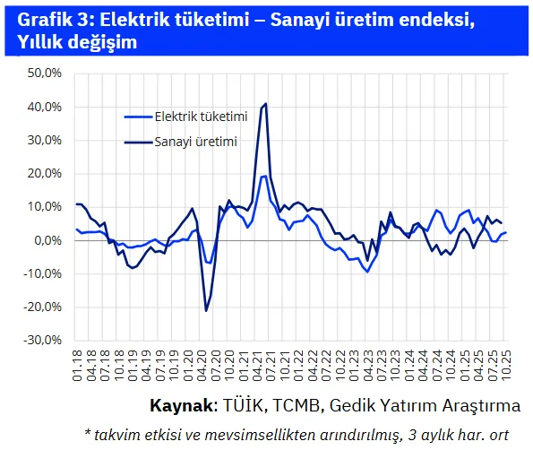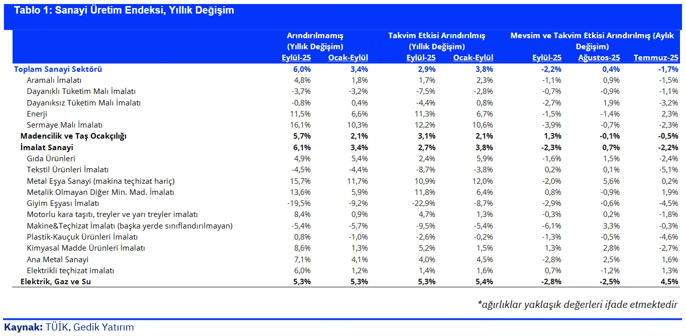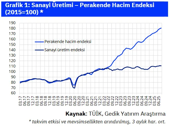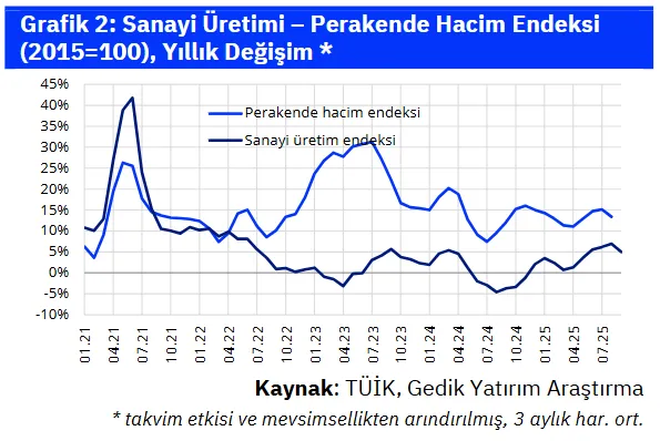 Yılın ilk dokuz ayında üretimdeki toparlanma daha çok yatırım ve enerji odaklı sektörlerde yoğunlaşırken, tüketim mallarına dayalı üretim kalemlerinde kırılganlık sürüyor. Bu görünüm, sanayi üretiminin büyümeye katkı vermeye devam ettiğini ancak ivmenin dengesiz bir yapıya sahip olduğunu ortaya koyuyor. Önümüzdeki dönemde kredi koşullarındaki olası gevşeme üretimi destekleyebilir; buna karşın küresel talepteki belirsizlikler, ihracat pazarlarında zayıf görünüm ve yüksek finansman maliyetleri sanayi üretimi açısından aşağı yönlü risk oluşturmaya devam ediyor.
