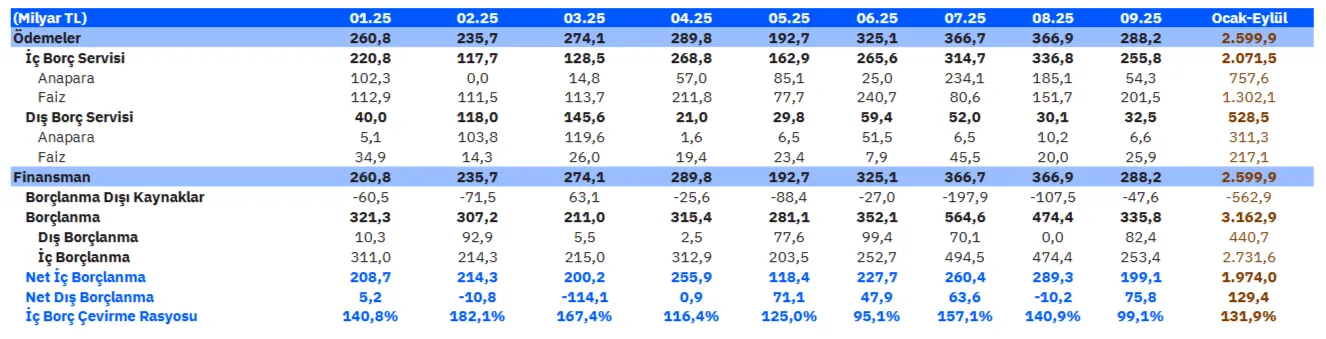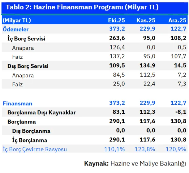 Hazine Ekim - Aralık dönemi toplamında ise 127 milyar TL’si anapara ve 340 milyar TL’si faiz olmak üzere 467 milyar TL iç borç geri ödemesi gerçekleştirecek. Dış borç geri ödemelerinin TL karşılığının ise yaklaşık 259 milyar TL olması öngörülüyor. Hazine toplamda 538 milyar TL üzerinde iç borçlanma planlarken, bu yaklaşık %118,2’lik bir iç borç çevirme rasyosuna denk geliyor. Bu rakamlara göre, bu dönemde, Hazine’nin net iç borçlanma tutarının (yeni tahvil ihracının) ise yaklaşık 412 milyar TL olması öngörülüyor.
