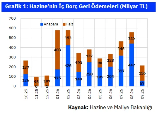 Takvimde Ocak 2026 döneminde iç borç ödemelerinin yaklaşık 582 milyar TL’ye yükselmesi dikkat çekiyor; bunun arkasında hem yüksek faiz yükü (406,7 milyar TL) hem de yoğun anapara geri ödemeleri (174,9 milyar TL) bulunuyor. Kasım ve Aralık aylarına kıyasla bu artış, Hazine’nin yıl başında yüklü iç borç itfalarıyla karşı karşıya olduğunu gösteriyor. Bu dönemde piyasa borçlanmalarındaki planlama da sert şekilde artarak 584 milyar TL olarak belirtilmiştir; iç borç çevirme oranının ise %100,4 seviyesinde gerçekleşmesi öngörülmektedir.