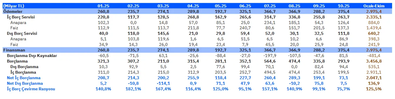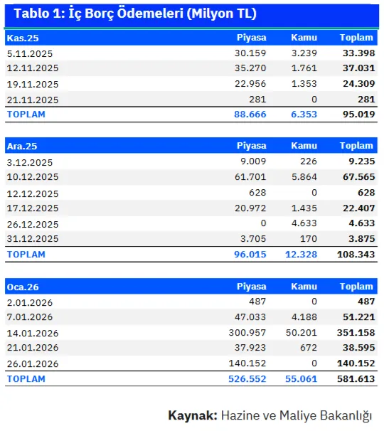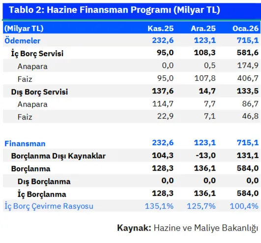 Hazine Kasım-Ocak dönemi toplamında ise 175 milyar TL’si anapara ve 610 milyar TL’si faiz olmak üzere 785 milyar TL iç borç geri ödemesi gerçekleştirecek. Dış borç geri ödemelerinin TL karşılığının ise yaklaşık 286 milyar TL olması öngörülüyor. Hazine toplamda 848 milyar TL üzerinde iç borçlanma planlarken, bu yaklaşık %120,4’lük bir iç borç çevirme rasyosuna denk geliyor. Bu rakamlara göre, bu dönemde, Hazine’nin net iç borçlanma tutarının (yeni tahvil ihracının) ise yaklaşık 673 milyar TL olması öngörülüyor.