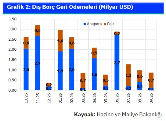 Hazine’nin Eylül 2026 sonuna kadar açıkladığı borç geri ödeme projeksiyonlarına göre Ekim 2025 ile Eylül 2026 arasında 4,2 trilyon TL’ye yakın iç borç geri ödemesi görünüyor. Kısa vadeli tahvil ihraçları dikkate alındığında bu tutarın da aşılacağını söyleyebiliriz. Bu dönemde öngörülen dış borç geri ödemesi ise 21,5 milyar $’ı aşıyor, ki bu da iç borçlanmanın bir bölümünün dış borç geri ödemelerine aktarılmasının gerekeceğine işaret ediyor. Bu dönemde öngördüğümüz nakit bazlı faiz-dışı açık da dikkate alındığında, Eylül 2026 sonuna kadar olan dönemde Hazine’nin iç borçlanma ihtiyacının 4,5 trilyon TL’ye ulaşabileceğini (hatta aşabileceğini) düşünüyoruz. Bu da aylık ortalama 370-380 milyar TL’lik bir miktara tekabül ediyor. Buna göre, iç borç çevirme rasyosu da %120’nin üzerinde gerçekleşebilir.