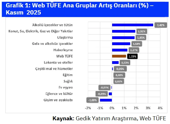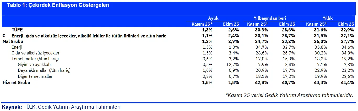 Kasım ayında TÜFE enflasyonunun aylık %1,3 olacağını tahmin ediyoruz. Ekim ayında web üzerinden topladığımız Web TÜFE verilerine dayanarak aylık enflasyonun %1,3 olarak gerçekleşeceğini ve %1,15 olarak gerçekleşen Web TÜFE verisinin bir miktar üzerinde gerçekleşeceğini değerlendiriyoruz. Yılın son 2 ayı mevsimsel etkilerle enflasyonu aşağı çekerken bu ay özelinde webde Kasım indirimlerinin temel mallarda yoğun etkisini gördük. Saha fiyatlarında bu etkinin daha sınırlı olması sebebiyle resmi enflasyonun web verilerinden sınırlı da olsa üstünde olmasını bekliyoruz.