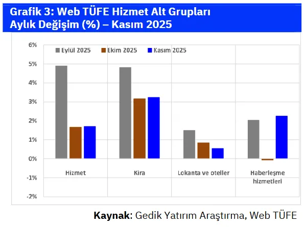 Kasım ayında hizmet enflasyonunun aylık %1,5 olacağını tahmin ediyoruz. Mevsimsel olarak hizmet enflasyonu son çeyrekte zayıf seyrederken başta kira sözleşme yenileme oranlarının düşmesi kira kanalından destek verirken lokanta–otel grubunda da buna benzer olarak yavaşlama görmekteyiz. Kira enflasyonunun geçen ayki %3,7 seviyesinden %3 dolayına yavaşlaması ve lokanta–otel ile diğer hizmetler grubunda yavaşlamanın devam etmesini bekliyoruz. Ulaştırma hizmetleri grubunda toplu taşıma ücretlerinde bir değişim gözlenmezken ara tatil döneminin olması sebebiyle şehirlerarası otobüs bileti ile uçak bileti fiyatlarında artışlar gözlemledik. Tüm bu görünüme rağmen %1,5 hizmet enflasyonu mevsimsellikten arındırılmış olarak %3,1 düzeyinde dirençli bir seviyeye işaret ediyor.