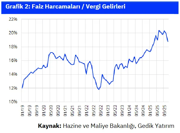 Faiz dışı dengedeki ciddi düzelmeye rağmen bütçe açığının gerilememesinin temel nedeni, faiz harcamalarındaki hızlı artış. Faiz harcamaları geçen yılın ilk 11 ayında 1,2 trilyon TL seviyesindeyken, bu yılın aynı döneminde 1,94 trilyon TL’ye yükseldi. Bu da yıllık bazda %62’lik bir artışa işaret ediyor.
