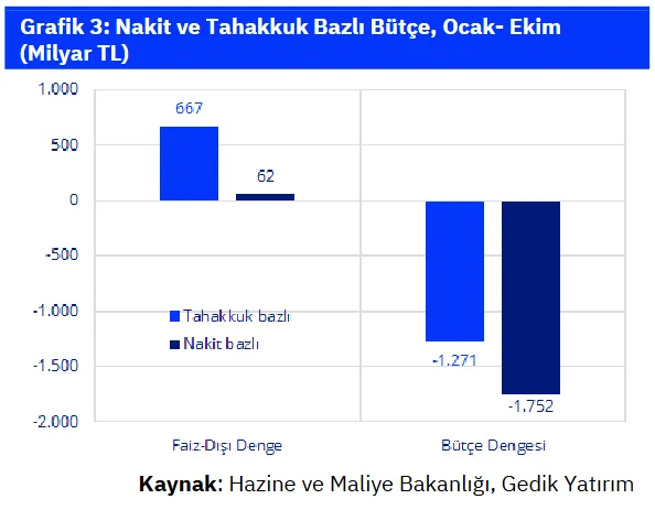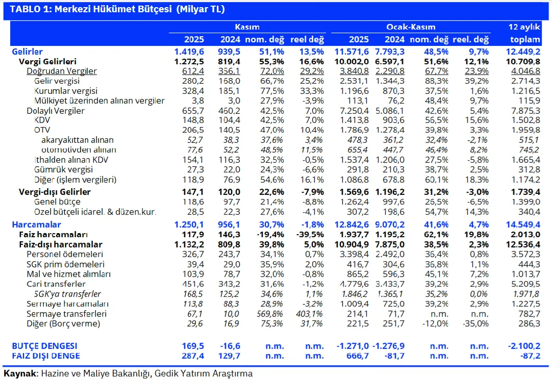Kasım sonuçlarıyla birlikte 12 aylık birikimli bakıldığında bütçe açığında belirgin bir gerileme yaşandı. Kasım sonuçlarıyla beraber, 12 aylık birikimli bazda bütçe açığı 2,29 trilyon TL’den 2,10 trilyon TL’ye, faiz dışı açık ise 245 milyar TL’den 87 milyar TL’ye doğru geriledi. Bu rakamlar 2024 yıl sonu itibarıyla sırasıyla 2,11 trilyon TL ve 836 milyar TL açık seviyesindeydi.