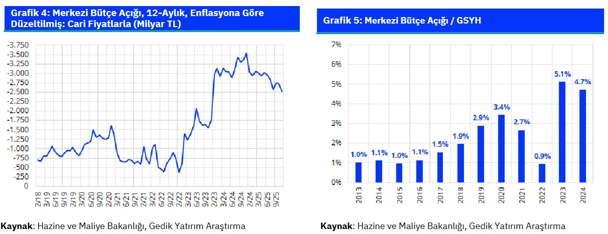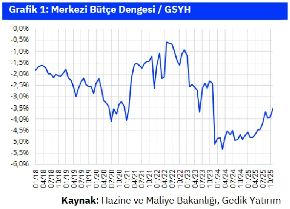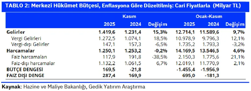 Vergi gelirleri revize hedefin üzerinde gerçekleşebilir. İlk 11 aylık gerçekleşmeler, vergi gelirlerinin yıl sonunda orijinal hedefin altında kalsa da revize hedefin 200–250 milyar TL üzerinde gerçekleşebileceğine işaret ediyor. Harcamaların ödenekler içinde kalması halinde merkezi bütçe açığı/GSYH oranı %3,0 sınırına daha yakın gerçekleşebilir. Ancak harcama tarafında ödenek aşımı yaşanması durumunda bu oranın %3,5 civarında oluşması beklenebilir.