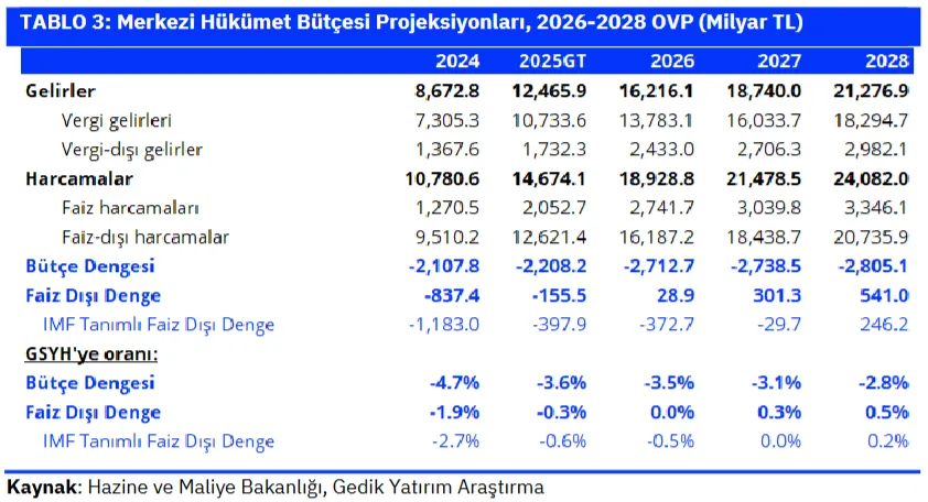 OVP ile 2025 yıl sonu bütçe açığı projeksiyonu 1,9 trilyon TL’den (GSYH’nin %3,1’i) 2,2 trilyon TL’ye (GSYH’nin %3,6’sı) revize edilmişti. Bu revizyon yapılırken toplam vergi tahsilat hedefi de 11,1 trilyon TL’den 10,7 trilyon TL’ye çekilmişti.