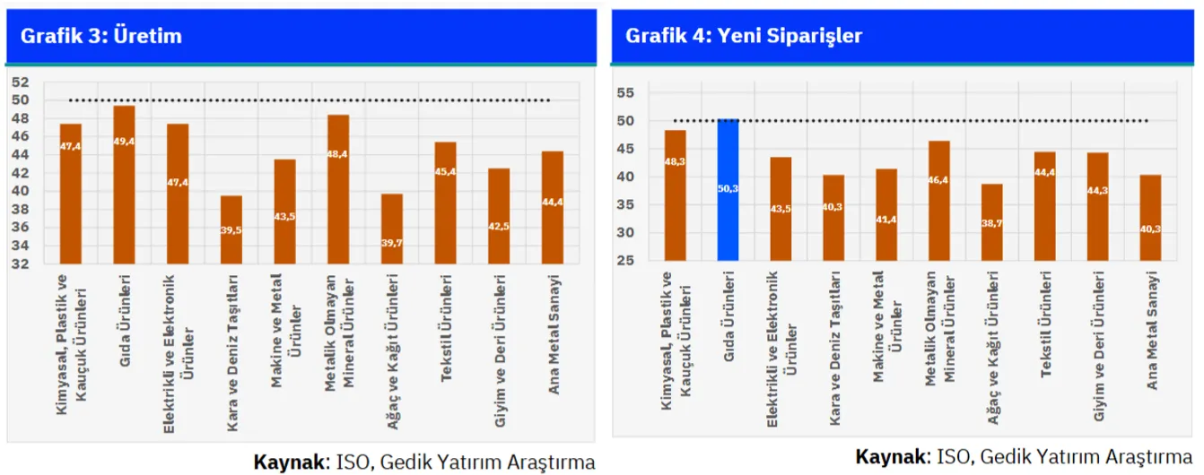 • Gıda sektöründe yeni siparişler üst üste üçüncü ay artarken üretim hafifçe azaldı; tekstilde üretim ve sipariş daralması hız kesmiş olsa da istihdam düşüşü belirginleşti.