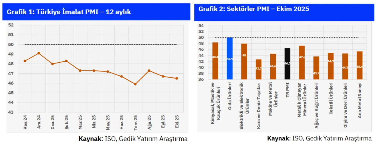 İstanbul Sanayi Odası Türkiye İmalat PMI, Ekim’de 46,5’e gerileyerek Eylül’deki 46,7 seviyesinden düşüş gösterdi. Endeks, üst üste 19.ay 50,0 eşik değerinin altında kaldı. İSO’nun yayınladığı basın bülteninden öne çıkardığı bazı tespitleri şöyle özetleyebiliriz: